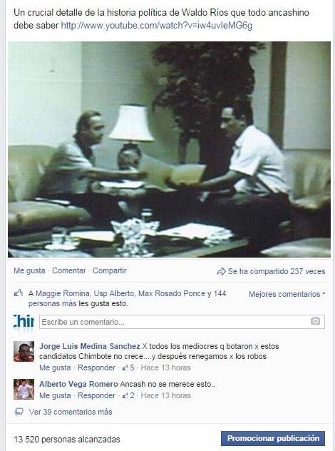 Así, en menos de 12 horas, el post referido al pasado del candidato regional Waldo Río, sentenciado judicialmente por recibir dinero de Vladimiro Montesinos, tuvo más de 13 mil personas alcanzadas en el facebook de Chimbote en Línea. El post muestra una foto de archivo y referencial de Vladimiro Montesinos en la sala del entonces Servicio de Inteligencia Nacional (SIN) y enlaza al video de la sentencia a Waldo Ríos por "tránsfuga".