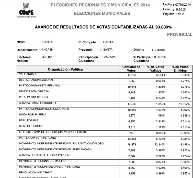Chimbote en Línea (Elecciones 2014).-La Oficina Nacional de Procesos Electorales (ONPE) emitió hoy el resultado al 100 por ciento de actas procesadas para la elección del alcalde de las cuatro Provincias y 25 Distritos de la ODPE Santa, para el periodo 2015 – 2018.