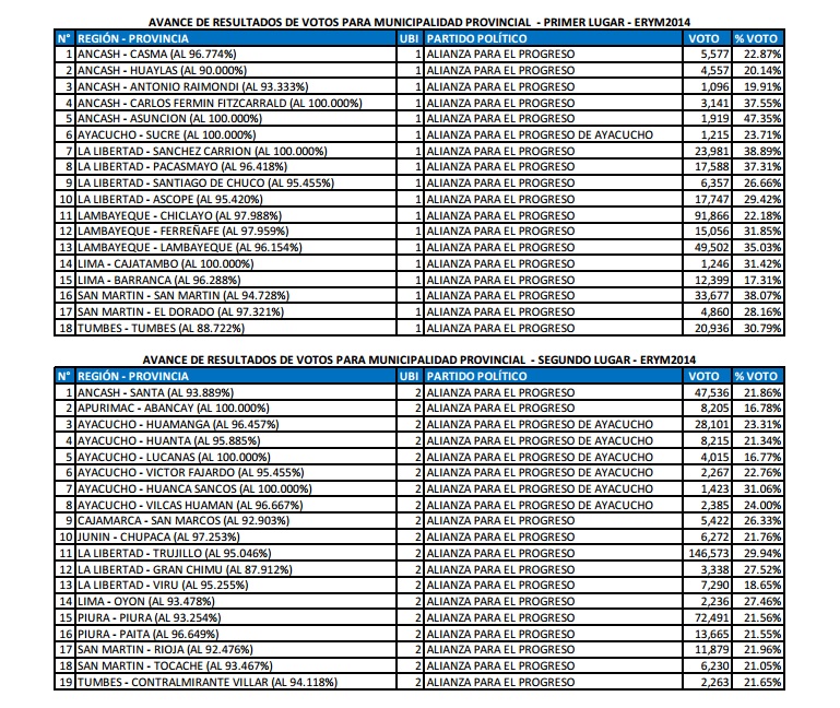 Cabe resaltar que Alianza Para el Progreso alcanzó el segundo lugar en 19 provincias del país, por un margen muy estrecho respecto a los partidos favorecidos.