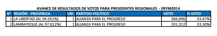 También ganó 23 consejerías regionales: 3 en Ancash, 1 en Apurímac, 3 en Ayacucho, 8 en La Libertad, 3 en Lambayeque, 3 en Lima, 1 en Pasco, y 1 en San Martín. (Redacción central-con datos de APP)