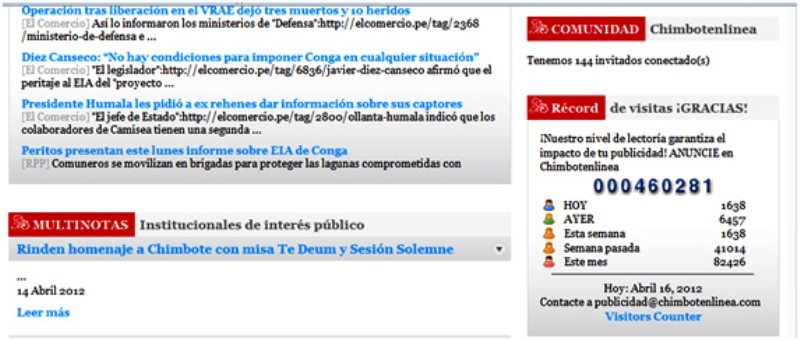Chimbotenlinea.com (Redacción central) Nuestro diario digital Chimbote en Linea alcanzó su más alta cifra de visitas: 6457 personas visitaron ayer el portal para informarse de los acontecimientos más importantes suscitados ayer. Esta preferencia de los cibernautas nos compromete a seguir mejorando nuestro servicio informativo a través del periodismo digital.Chimbotenlinea.com es un proyecto periodístico, lanzado hace un año, que está a cargo de un staff de periodistas profesionales de Chimbote.
