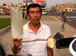 Esta mañana llegó a la plaza de armas para protestar y pedir la atención de Sedachimbote. Con una botella de plástico en mano mostró el agua turbia que está llegando a su comunidad.