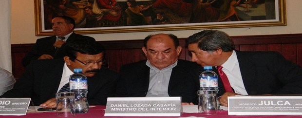 Ministro del Interior estuvo esta mañana en Chimbote. En la foto junto al congresista Modesto Julca.Chimbotenlinea.com (Por: Lindberg Cruzado).-El ministro del Interior, Daniel Lozada Casapia, prometió esta mañana en Chimbote que los crímenes cometidos los últimos meses en Ancash serán resueltos, como los homicidios al fiscal provincial de Casma, Luis Junior Sánchez Colona, del exalcalde de Huarmey, Pedro Tapia Marcelo, y de la joven universitaria Sheyla Arce Arrelucea.