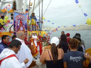 Nuestro patrono fue colocado en la embarcación llamada Hillary II, en donde sus tripulantes recibieron a la venerada imagen con mucho amor y donde la alegría contagió e hizo baliar a los presentes. Luego se hizo el trasbordo del Santo patrón a la embracación principal Rivar IV, donde esperaban las principlaes autoridades locales y regionales, capitanes y comandantes portuarios; asimismo de la