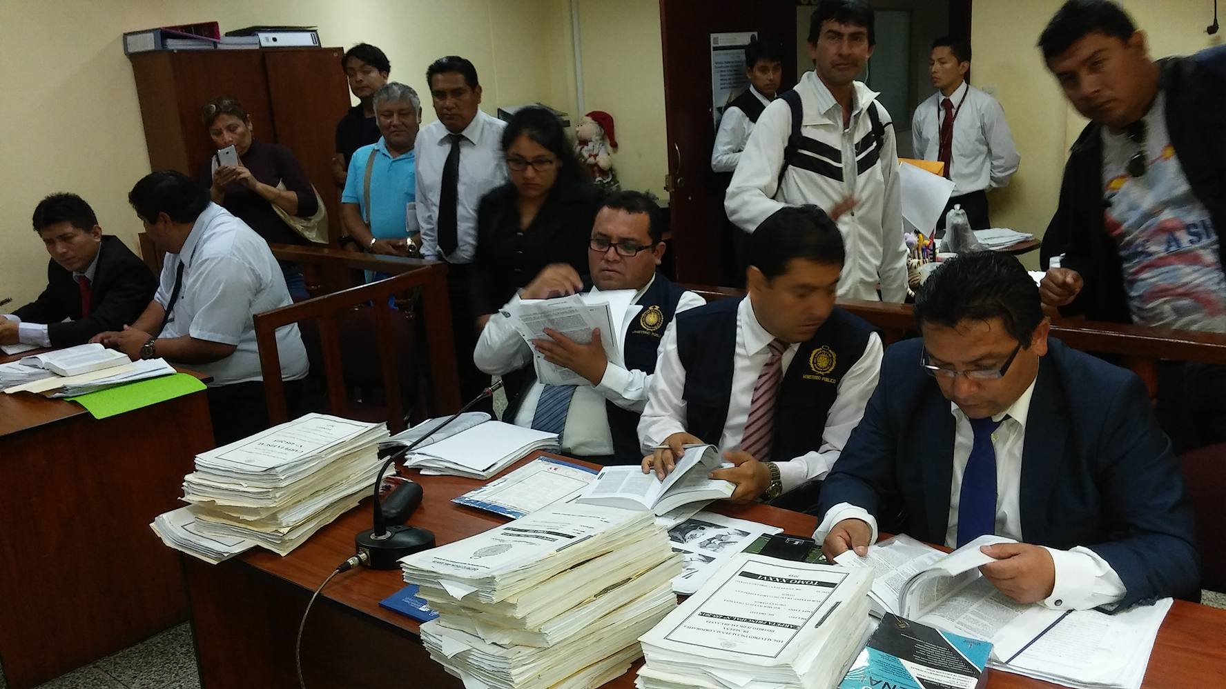 A la audiencia se hicieron presente los representantes de la Cuarta Fiscalía Penal Corporativa del Santa, Edwin Cipriano Lozano y Julio Montoya Abanto, asimismo la defensa legal de los acusados, Estuardo Montero Cruz y Carlos Cajas Loayza. Estos últimos solicitaron el pedido de sus patrocinados Jhonatan Solís Farro, Noemí Rubina Moreno y Fanny Medina la Rosa.
