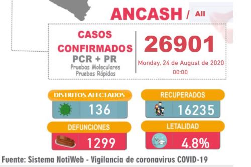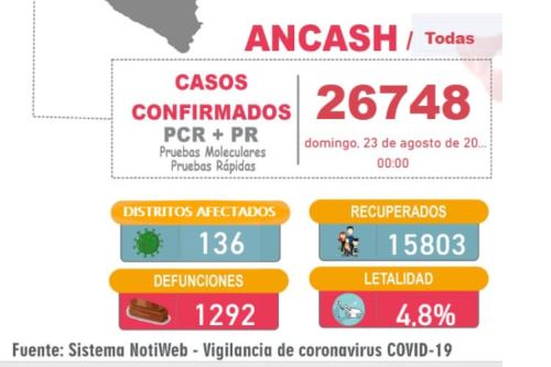 Las defunciones en la región Áncash ascienden a 1,292; el índice de letalidad de la región es de 4.8 %.