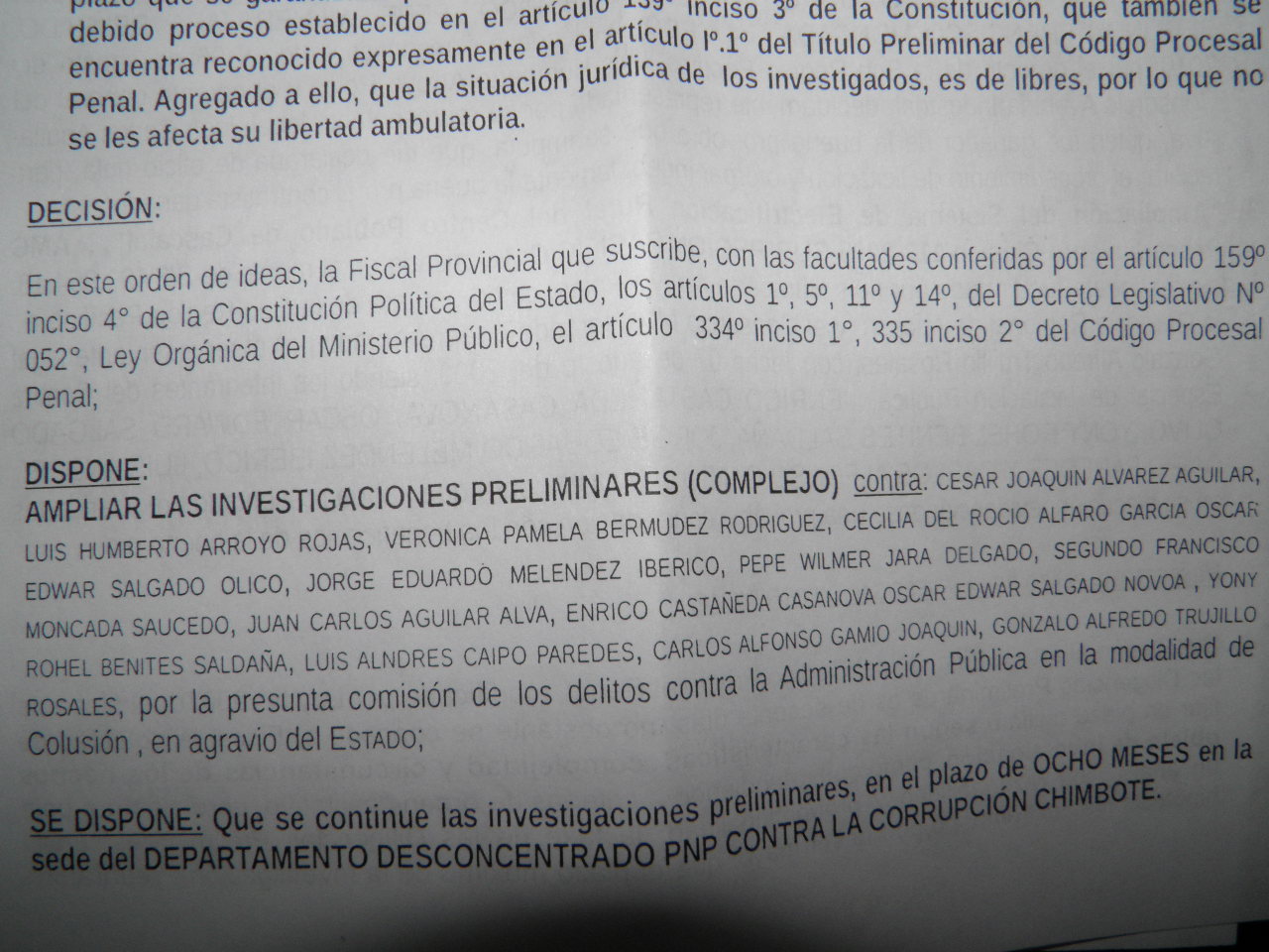 Chimbote en Línea.- Por ocho meses más la Tercera Fiscalía Especializada en Delitos de Corrupción de Funcionarios del Santa dispuso ampliar y declarar compleja la investigación preliminar seguida contra el encarcelado exgobernador regional, Cesar Álvarez y el preso exgerente de la Subregión Pacífico, Luis Arroyo Rojas, ambos implicados en el otorgamiento irregular de la buena pro de dos obras ejecutadas.