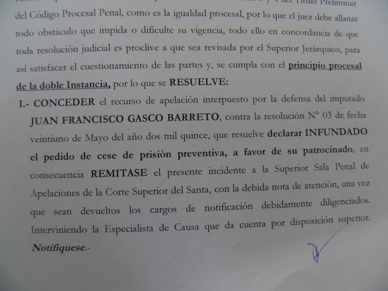Chimbote en Línea.- El titular del Tercer Juzgado de Investigación Preparatoria de la Corte Superior de Justicia del Santa, Luís Prez Granados concedió el recurso de apelación interpuesto por la defensa técnica del prófugo exalcalde de Nuevo Chimbote, Francisco Gasco Barreto.