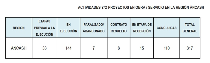 De la cifra, 317 se encuentran en estado de Obra/Servicio (en ejecución o concluidas). De esta manera, existen 144 obras y servicios en ejecución; 7 paralizadas y abandonadas; 15 en etapa de recepción y 8 con contratos resueltos (cancelados).