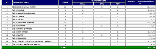 La Contraloría emitió 3 429 informes de control (1 020 de control posterior, 16 Carpetas de Control, 65 de control previo y 2 328 de control simultáneo o preventivo) y se identificaron 709 responsabilidades penales (por los delitos de negociación incompatible, colusión y peculado, entre otros), 219 responsabilidades civiles y 6 463 responsabilidades administrativas, en su labor auditora en Áncash.