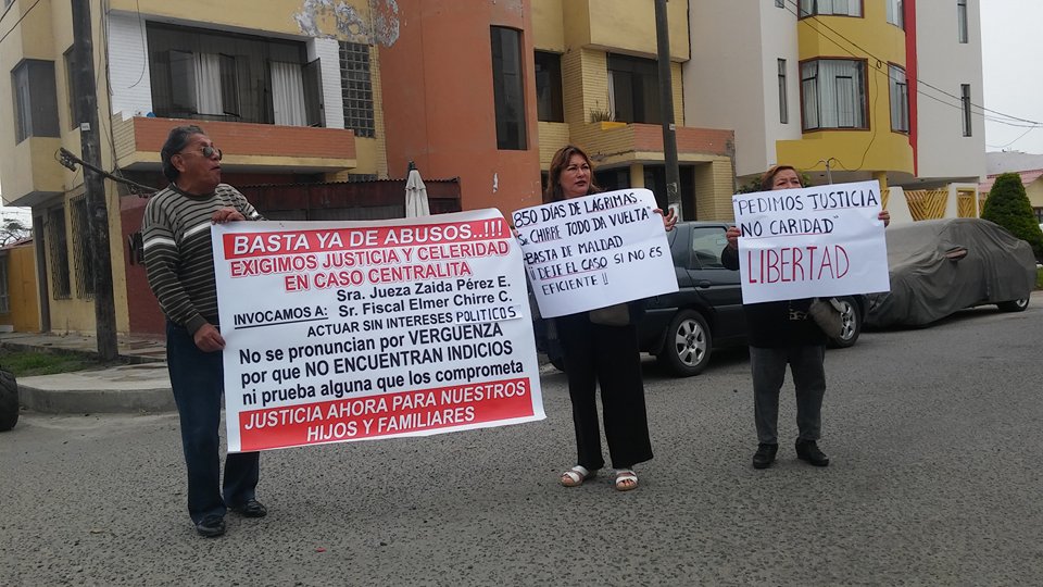Mientras los fiscales se encontraban en el interior de su vehículo, los padres de los periodistas Ingrid Casas, Illeana Corcuera, Felipe Bermúdez, entre otros, se apostaron hasta el local de la “Centralita” con carteles en mano exigiendo justicia para sus hijos, quienes se encuentran prófugos de la justicia.