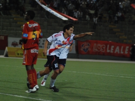 Chimbotenlinea.com (Por: Lindberg Cruzado) José Gálvez venció esta noche por la mínima diferencia al Sport Huancayo gracias a un blooper del golero Sebastián Cuerdo que lleno de nervios le cedió un pase al delantero chimbotano Martín Arzuaga y este a su vez entregó el balón a su compañero César Medina para que marque el único gol en el Centenario. (Foto: Cortesía La Industria)