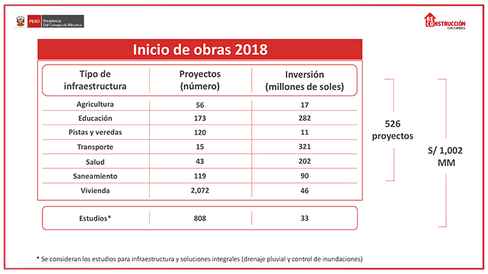 Como en cada una de las regiones contempladas en la RCC, Áncash ya cuenta con un plan de inversiones 2018, cuya suma asciende a S/ 1002 millones, que estarán destinados a ejecutar 526 proyectos con obras iniciadas, la entrega de 2072 bonos de vivienda y el inicio de 807 estudios en todo el ámbito regional.