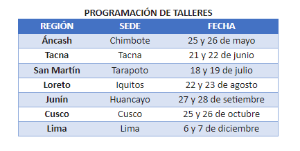 Los talleres se desarrollarán en las regiones Áncash (Chimbote), Tacna, San Martín, Loreto, Junín, Cusco y Lima. Estas capacitaciones son gratuitas y están dirigidas a funcionarios, directivos, profesionales y técnicos de los gobiernos locales y regionales, así como a ciudadanos interesados en el tema.