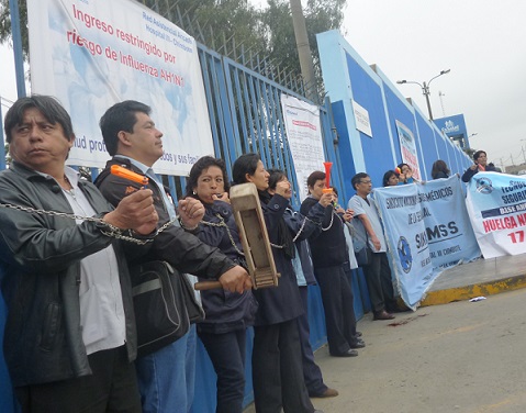 Chimbote en Línea (Salud).- Al igual que las enfermeras, los tecnólogos médicos quienes acatan una huelga nacional indefinida desde el pasado 7 de julio, se apostaron en la puerta principal del Hospital III de EsSalud para encadenarse y desangrarse, a fin de que el Estado escuche sus demandas.