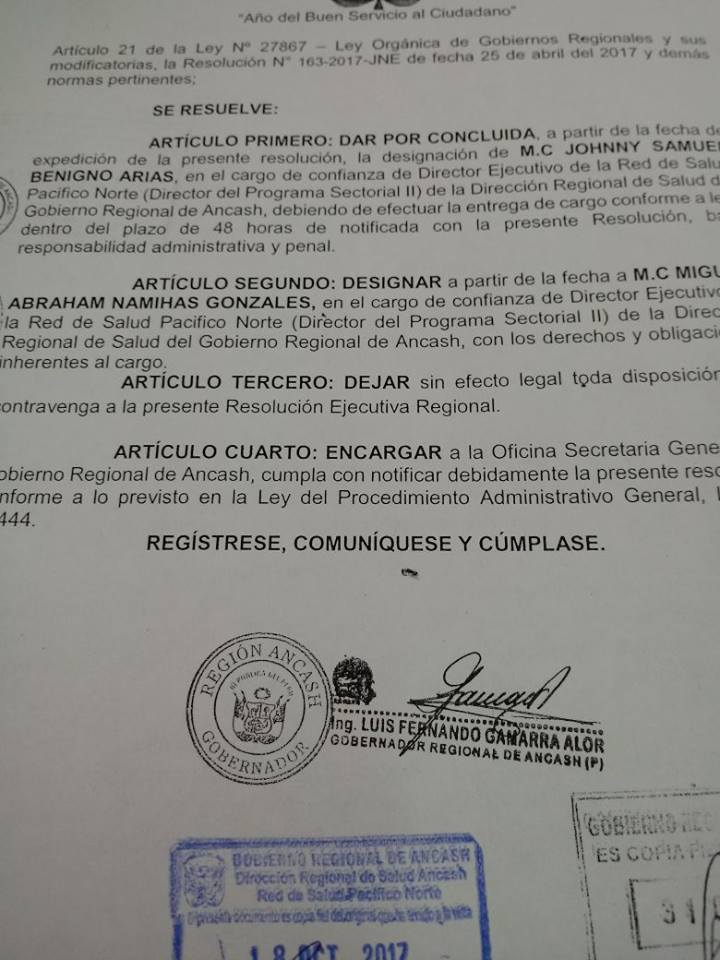 Según el documento, se designa al médico cirujano, Miguel Abraham Namihas Gonzales para ocupar este cargo el cual deberá ser entregado en las próximas horas, a fin de que se tomen las riendas de la institución, ante la exigencia de los propios trabajadores.