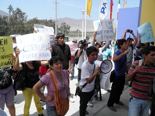Mientras que en horas de la mañana los alumnos participaron de un plantón en el frontis de la facultad, en Nuevo Chimbote, mostrando pancartas alusivas a la salida del rector.