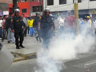 Chimbotenlinea.com (Por: Lindberg Cruzado).- Efectivos policiales lanzaron gas lacrimógeno a los cientos de maestros que marchaban por el centro de Chimbote para lograr de dispersarlos y evitar que congestionen el tránsito vehicular tomando las principales avenidas.
