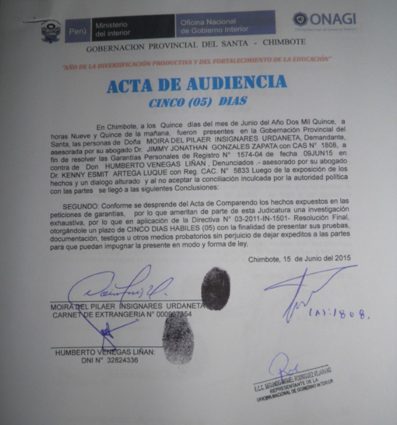 Chimbote en Línea.- La subgerente de Servicios Generales y Equipo Mecánico de la Municipalidad Provincial del Santa, Moira Infignare Urdaneta acudió hasta la Gobernación de Chimbote para responder sobre la agresión salvaje que sufrió de parte de trabajador edil Humberto Venegas Liñán conocido como “Churre” y su hermano Cesar Augusto Rodríguez Liñán.