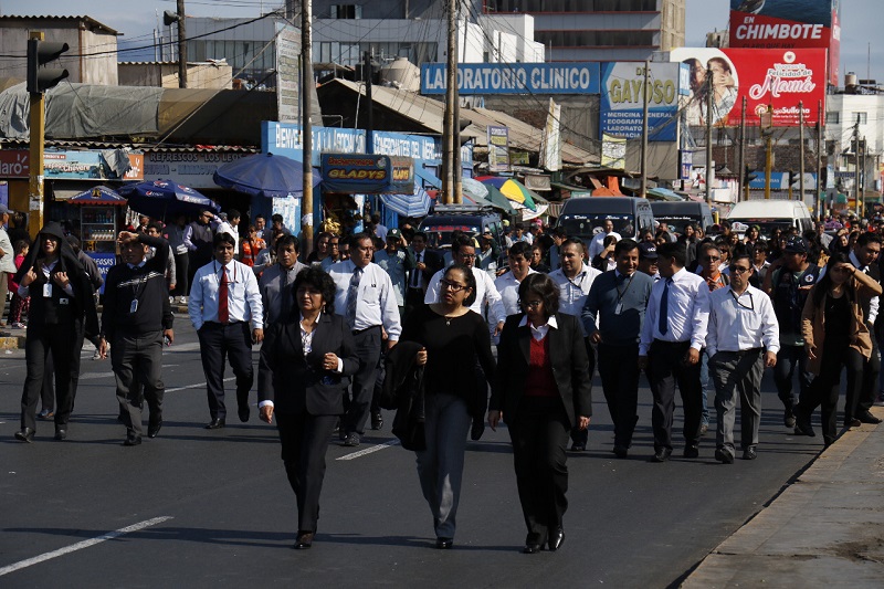 Desde las 3 de la tarde, al sonido de las sirenas, jueces y trabajadores abandonaron de manera ordenada los despachos judiciales, bajo la atenta mirada de los brigadistas de la Corte, a los que se sumaron sus similares de la comuna provincial del Santa.