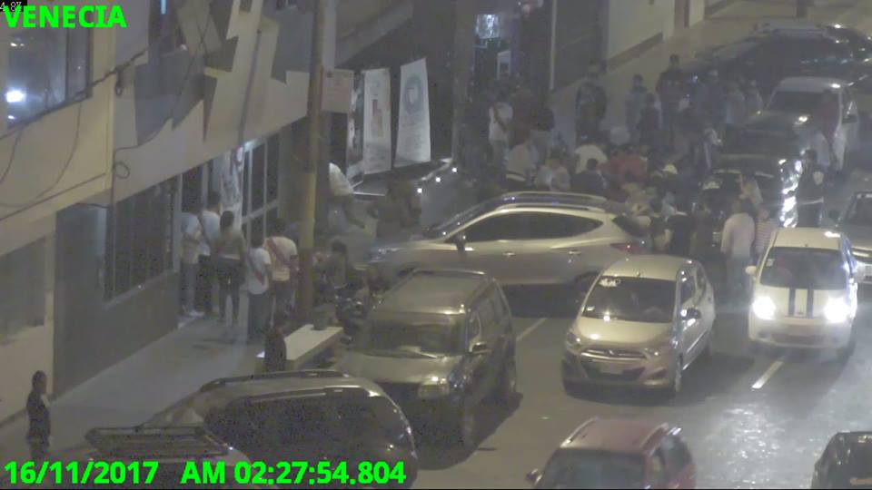 En imágenes se aprecia como un grupo de personas se enfrentan con el personal de seguridad de la mencionada discoteca; sin embargo cuando la situación parecía controlada dos de los tres sujetos ocasionan daños materiales en la entrada del local, arrojando objetos contra la puerta de vidrio.