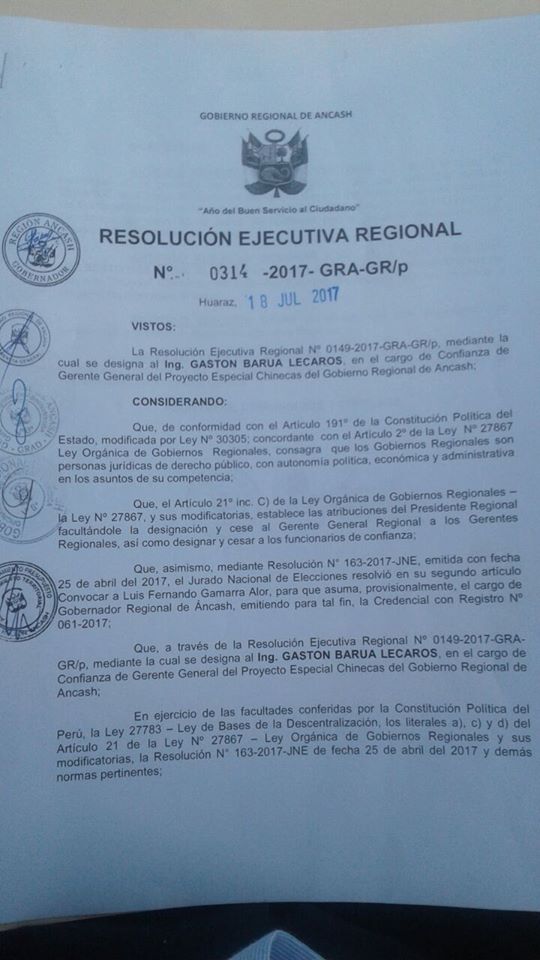 Chimbote en Línea.- Con Resolución Ejecutiva Regional N°314, el gobernador de Áncash, Luís Gamarra Alor cesó de sus funciones al gerente del proyecto especial Chinecas, Gastón Barua Lecaros y en su reemplazo designó en el cargo de confianza al ingeniero civil, Edilberto Noe Ñique Alarcón.