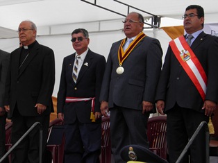 Chimbote en Línea (Locales).- El obispo Ángel Francisco Simón Piorno presidió hoy los actos festivos por las Bodas de Oro de la Diócesis de Chimbote. Izó el Pabellón Nacional y ofreció su discurso en la plaza de armas.