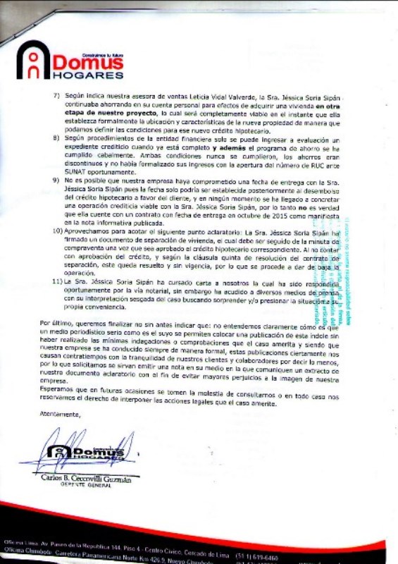 Chimbote en Línea.- La empresa Domus Hogares a través de su gerente general, Carlos Ceccovilli Guzmán rechazó la denuncia pública de la señora Jéssica Soria Sipán, quien hace unos días manifestó que había sido estafada con la no entrega de su vivienda, pese haber pagado 36 mil nuevos soles.