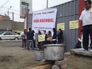 El equipo zonal de Pronaa Chimbote con arengas y pancartas en manos, acompañados de una tradicional olla común acata un paro de 24 horas exigiendo ser reubicados en otras plazas de los programas sociales que ofrecerá el Gobierno Central, debido a que el 31 de diciembre se concretará el cierre de dicho programa.