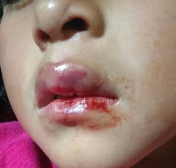 Milton Sánchez Villafana acompañado de su esposa contó que el pasado lunes su menor hija de tan solo 5 años cayó y sufrió daños en la dentadura y fuerte golpe en los labios y cara; sin embargo, adujo que la docente y directora, Luz Moncada- quien estuvo al cuidado- no le prestó los primeros auxilios o llevado a la posta médica que se encuentra cerca al plantel.