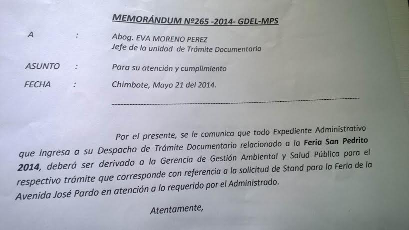 En el memorándum N°625-2014-GDEL-MPS, dirigido a la jefa de Trámite Documentario, Salgado Arroyo le comunica que todo expediente administrativo que ingrese a su despacho relacionado con la feria San Pedrito 2014 deberá ser derivado a la gerencia de Gestión Ambiental y Salud Pública, área a cargo de la cuestionada funcionaria, Lourdes Sandoval Rojas, a fin de que se efectúe cualquier trámite correspondiente para el alquiler de stand que como todos los años se ubica en las primeras cuadras de la avenida Pardo.