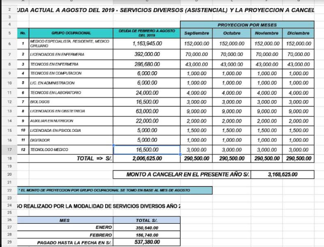 Cabe mencionar que se buscó, en todos los extremos, obtener la permanencia de la totalidad de locadores de servicio, pero la proyección de la deuda aumentaba a un promedio de 3 millones 168 mil 625 soles, monto que no se podía asumir, por no contar con disponibilidad. Sin embargo, las autoridades garantizaron los pagos de las deudas atrasadas desde febrero al 31 de Agosto 2019.