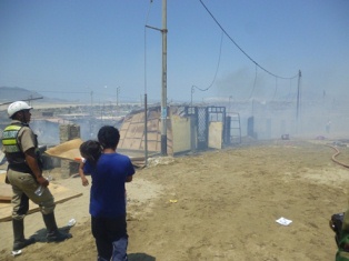 Chimbote en Línea (Nuevo Chimbote).- Un incendio de gran magnitud consumió en contados minutos 26 ranchos de las manzanas G y E del asentamiento humano Los Conquistadores II etapa, en Nuevo Chimbote. El siniestro se inició minutos antes de la 11 de mañana en la manzana G-13, lugar donde había varios kilos de carbón y se encontraba un niño de un año, quien resultó con quemaduras de primer grado en uno de sus brazos. (Fotos Liliana Capuñay )