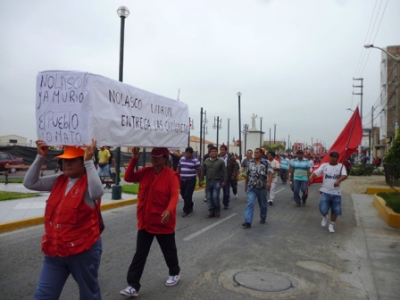 Cerca de 200 hombres del andamio marcharon por la avenida Pacífico desde el pueblo joven 3 de Octubre hasta la municipalidad donde quemaron un ataúd de cartón que llevaba escrito “Nolasco, el pueblo te mató”.