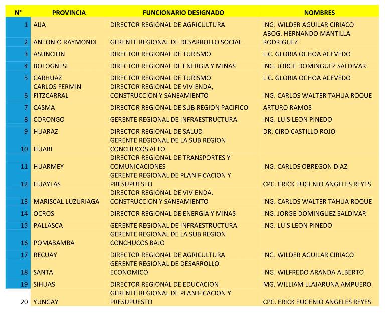 Las autoridades locales, provinciales y subprefectos en cada una de las 20 provincias de Áncash, y sus respectivos distritos, deberán estar atentos a la presencia de los funcionarios del GRA, a fin de coordinar acciones y optimizar los recursos que serán canalizados ante el gobierno regional y gobierno central.