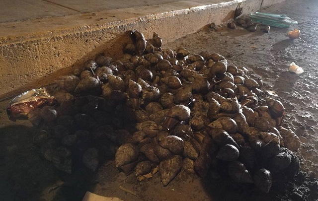 Agentes de la Unidad de Seguridad Ciudadana Chimbote que patrullaban por inmediaciones de la segunda cuadra del jirón José Olaya se percataron de la presencia de estos caracoles arrojados en la calle.
